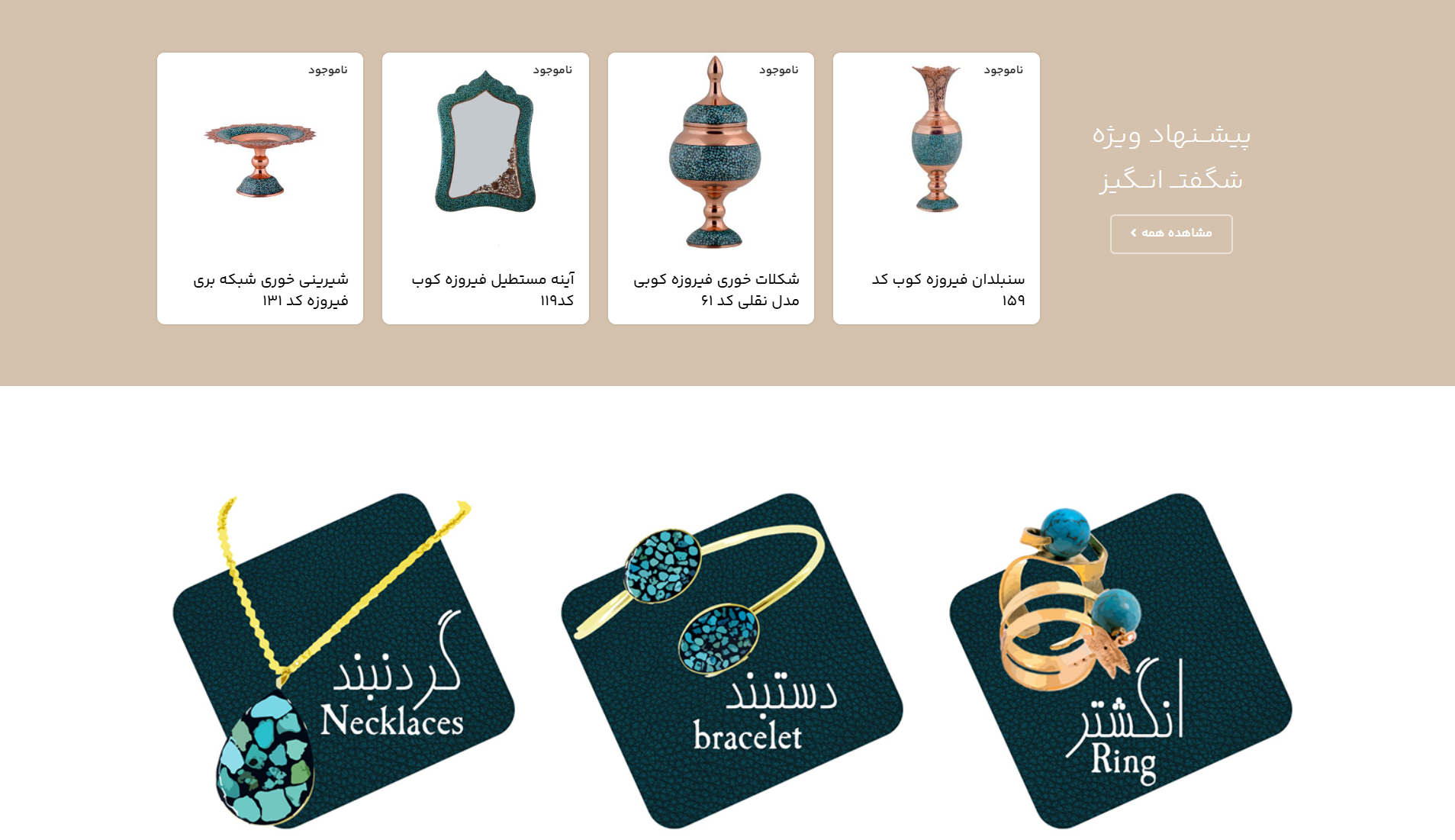 این فروشگاه مجموعه‌ای متنوع از صنایع‌دستی فیروزه‌کوبی را ارائه می‌دهد؛ از ظروف تزئینی و کاربردی مانند آجیل‌خوری، شیرینی‌خوری و گلدان گرفته تا زیورآلاتی همچون انگشتر، گردنبند و دستبند. همچنین بخش‌هایی برای سرویس‌های پذیرایی و وسایل دکوراتیو مانند آینه و شمعدان در نظر گرفته شده است. هر محصول با تصویر، توضیح و قیمت معرفی می‌شود و امکان افزودن به سبد خرید برای کاربر فراهم است، هرچند برخی کالاها در وضعیت ناموجود قرار دارند.